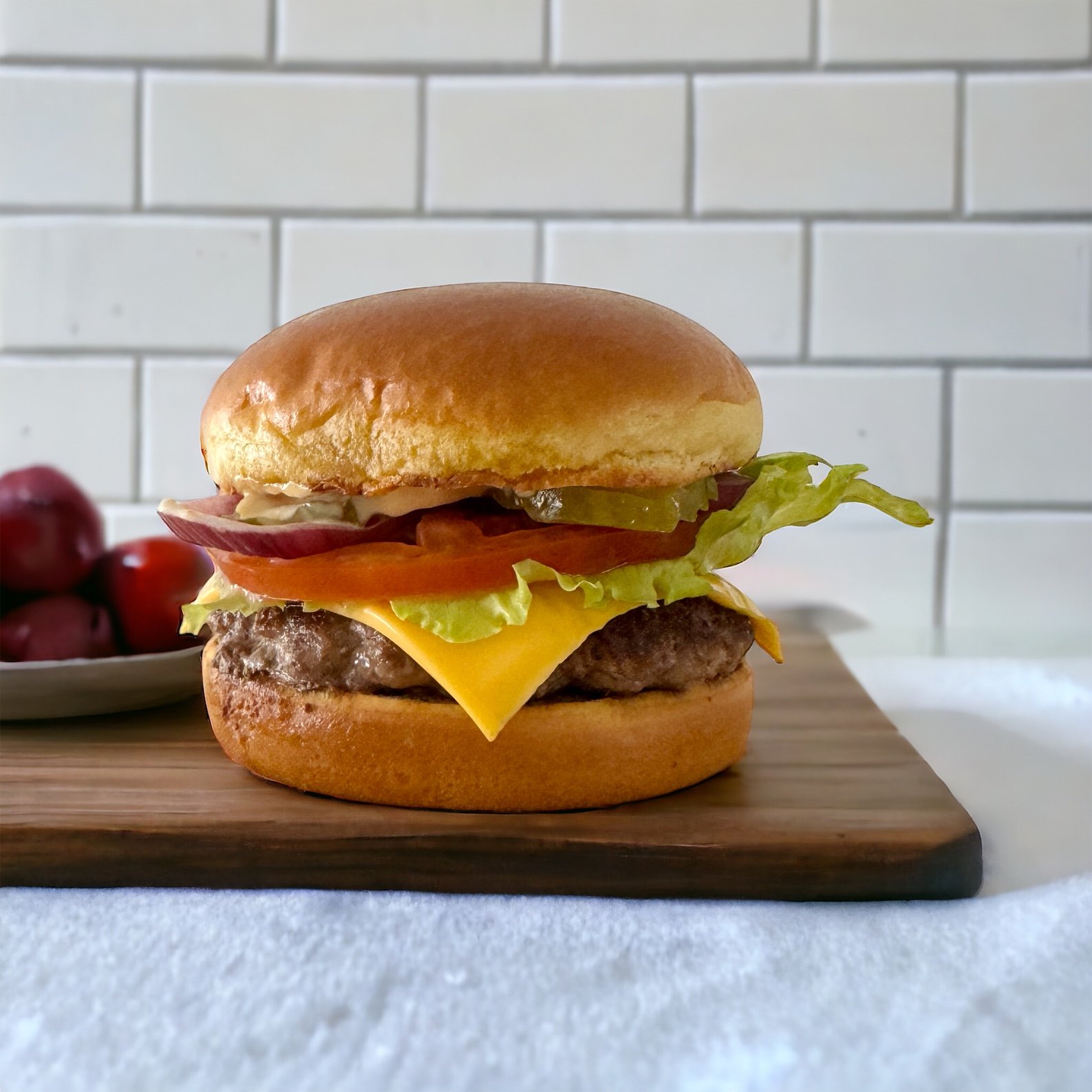 Jugosa carne de res, queso cheddar y cebolla morada, lechuga, tomate y pepinillos sobre suave pan brioche, coronada con nuestra irresistible salsa especial casera.